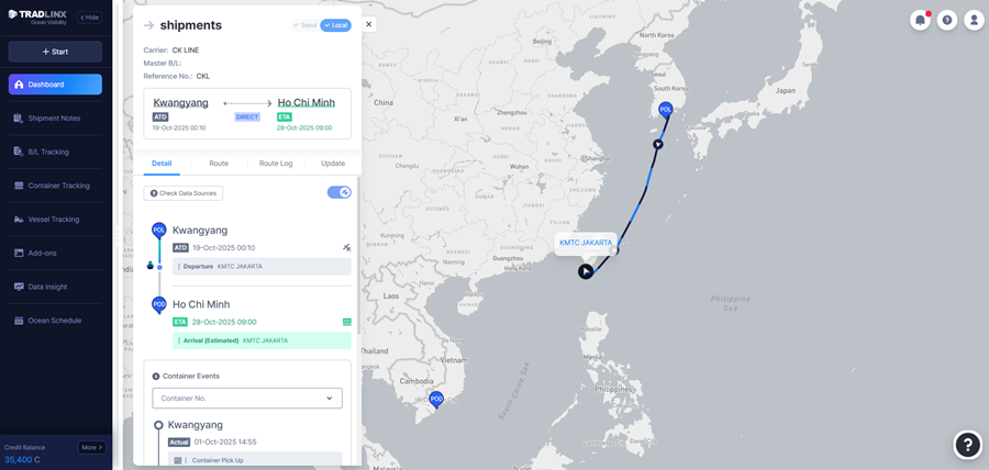 “제 화물은 지금 어디쯤 있나요?” 화주들이 가장 궁금해하는 질문입니다. 선사 홈페이지에 접속해 MBL 번호를 입력하는 번거로운 과정 대신, 트레드링스 Ocean Visibility 해상 화물 추적(Tracking) 기능으로 화물의 위치를 실시간으로 확인하고 화주와 간편하게 공유할 수 있습니다. 이는 단순한 정보 제공을 넘어, 화물의 여정을 투명하게 공유하며 고객에게 안정감과 신뢰를 주는 차별화된 서비스가 됩니다.