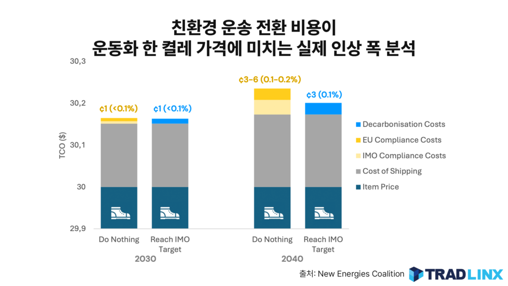 이해를 돕기 위해 우리가 흔히 신는 30달러짜리 운동화 한 켤레를 예로 들어보겠습니다. 아시아에서 생산해 유럽으로 보내는 이 운동화의 운송 과정이 전부 친환경으로 바뀐다면 가격은 얼마나 오를까요? 놀랍게도 2030년에는 약 0.01달러(1센트), 2040년이 되어도 약 0.03달러(3센트)가 오르는 데 그칩니다. 이를 퍼센트로 환산하면 0.1%도 되지 않는 미미한 수준입니다.