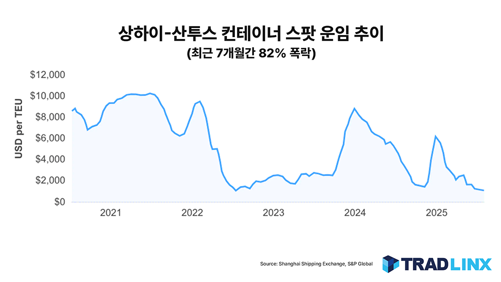 현재 아시아발 라틴아메리카 항로의 컨테이너 선사들은 유례를 찾아보기 힘든 급격한 운임 하락세에 직면해 있습니다. 상하이해운거래소(SSE)의 데이터에 따르면, 2025년 7월만 해도 상하이발 브라질 산투스행 스팟 운임은 TEU(20피트 컨테이너)당 $6,374를 기록하며 견조한 흐름을 보였습니다.