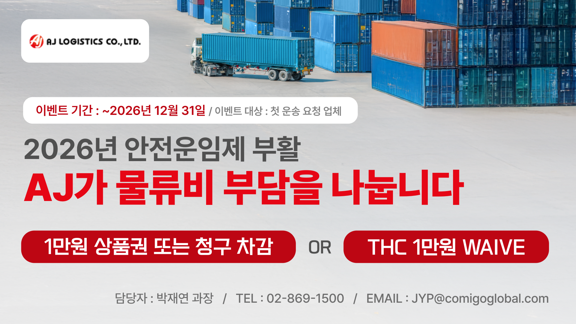 2026년 안전운임제 재시행으로 인해 컨테이너 운송료 상승이 현실화되었습니다. 물류비 고정 지출이 늘어 고민인 화주분들을 위해, AJ로지스틱스(AJ)가 실질적인 비용 절감 솔루션을 제공합니다.