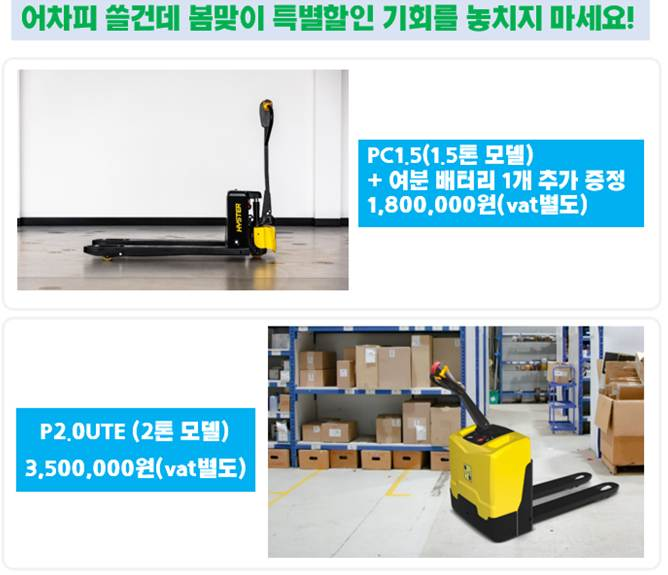 전동 파렛트 트럭은 단순한 장비가 아니라 물류 작업 효율을 크게 바꾸는 장비입니다. 작업량이 많은 물류센터나 제조 공장이라면 전동 장비 도입을 통해 작업 속도와 작업 환경을 동시에 개선할 수 있습니다. 전동 파렛트 트럭 도입을 검토하고 계신다면 하이스터 P2.0UTE 모델도 한 번 검토해 보시는 것을 추천드립니다.