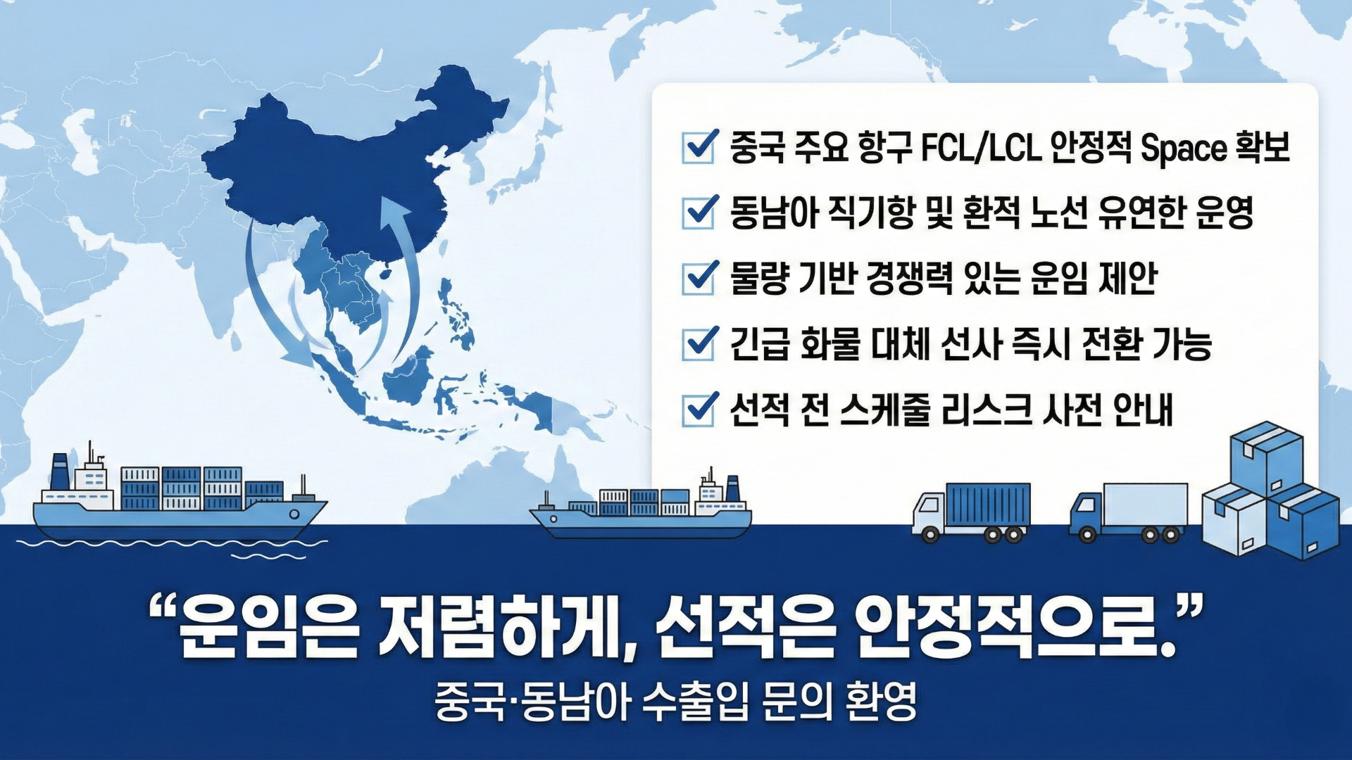 중국 · 동남아 수출입, 선복 걱정 없이 안정적인 운임으로 진행하세요!